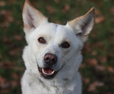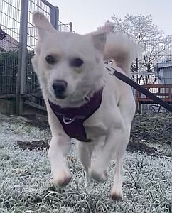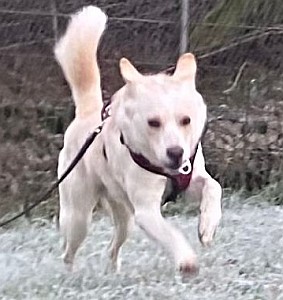 Der blonde Mischling Mäxchen wurde leider aus der Vermittlung zurückgegeben, weil er trotz intensiven Trainings und vieler Mühen nicht alleinbleiben mag.