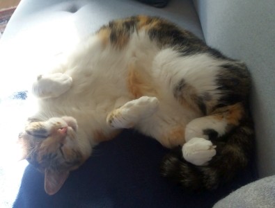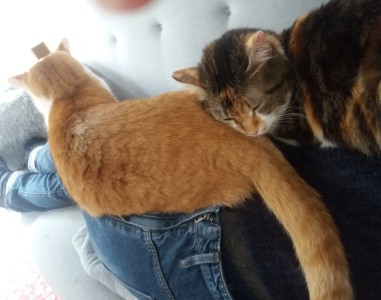 Sie gehen gerne raus, ich habe eine eingezäunte Terrasse, wo sie sich gerne aufhalten. Im Winter liegen sie aber lieber auf dem Ofen. Wenn man auf dem Sofa liegt oder irgendwo sitzt, ist man nicht lange alleine. Hier liegen sie auch schon mal gerne zusammen auf einem drauf und brauchen ihre Kuscheleinheiten.