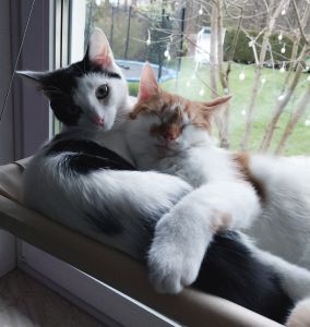 Auf dem Bild sehr ihr sie auf einem ihrer Lieblingsplätze, der Hängematte am Fenster. Ansonsten sitzen sie gerne auf dem Kamin, kuscheln sie sich aber auch allabendlich mit uns unter eine Decke auf dem Sofa oder toben mit den Kindern durchs ganze Haus. Wenn Suis Kastrationswunde gut verheilt ist, dürfen die beiden ab nächster Woche dann auch die Umgebung ums Haus erkunden.
