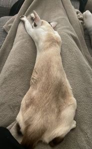 Nach dem Toben liebe ich es, bei meinen "Eltern" auf dem Schoß zu schlafen. Ich bin generell sehr gerne in deren Umgebung. Tagsüber liege ich bei Mama im Nacken, wenn sie am Schreibtisch sitzt, abends mit beiden auf dem Sofa, und nachts schlafe ich unter der Decke mit im Bett. Ich liebe es einfach, eingekuschelt zu sein, und brauche immer jemanden in meiner Nähe.